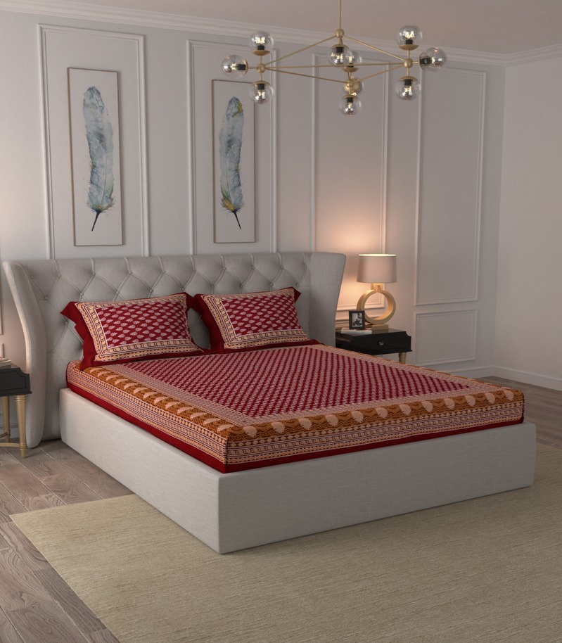 The rich red base with ornate white motifs, complemented by a contrasting brown border with bold decorative patterns, adds a timeless, yet contemporary look to your bedroom. Whether for everyday or special use, this bedsheet is a testament to good taste and comfort.