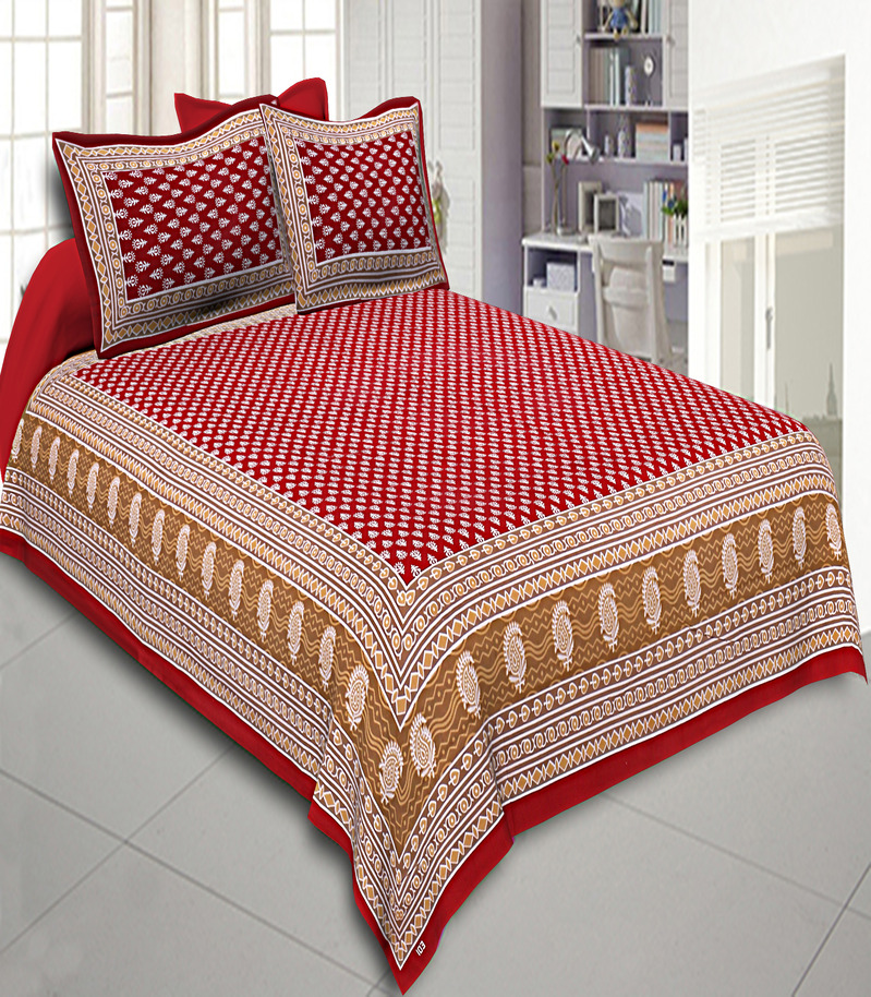 MVB 100% Pure Cotton Double Bed Sheet Set – Red & Brown Elegance with 2 Pillow Covers