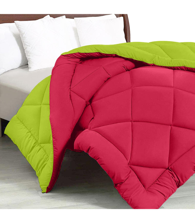 The reversible design displays vibrant Red and Lemon Green shades, adding a cheerful and refreshing look to your bedroom.