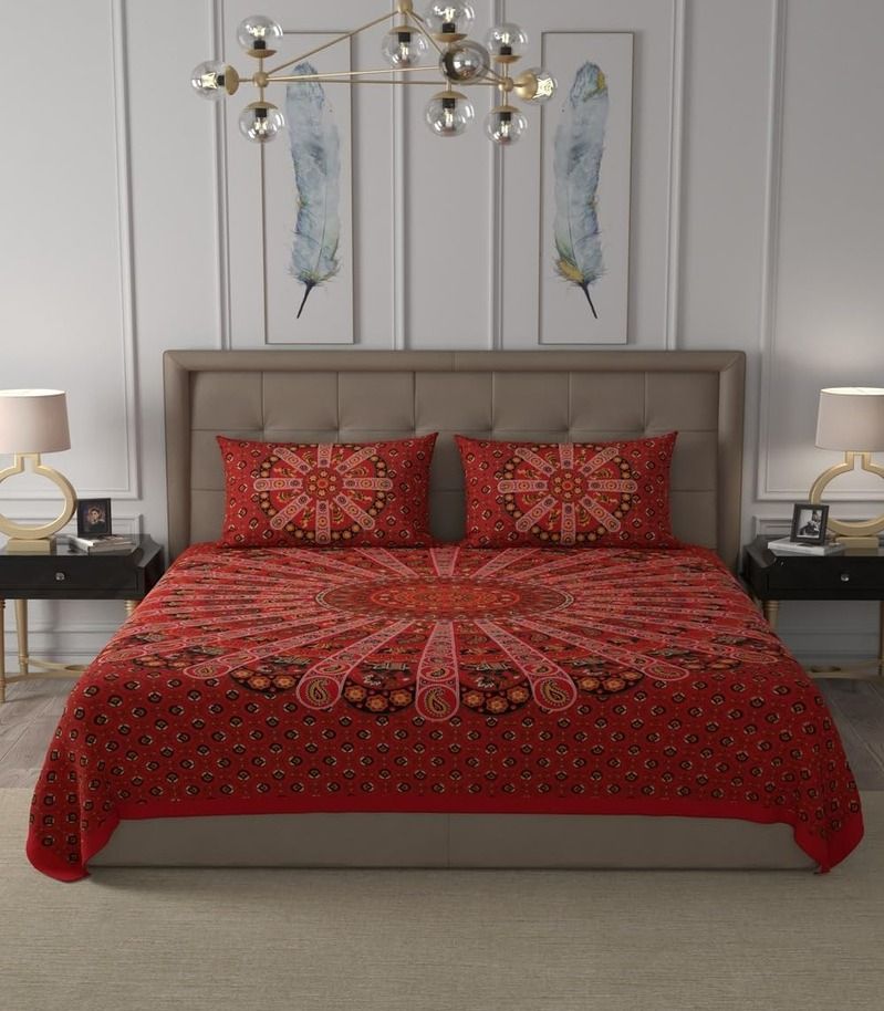 Rangoli Charm 180 TC Cotton Double Bedsheet Set – Red & Blue Sick of boring, lifeless bedsheets. Brighten up your bedroom with this Rangoli-inspired double bedsheet set in a vibrant blend of red and blue.