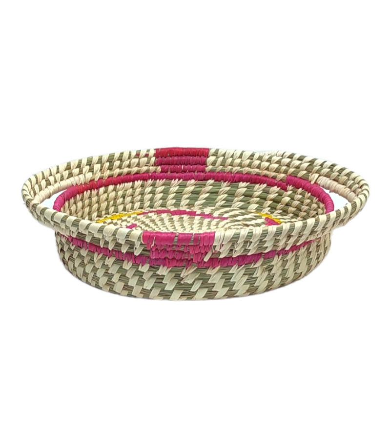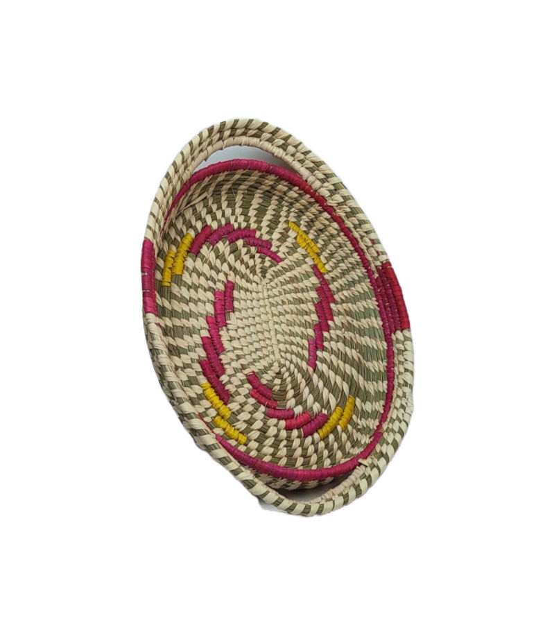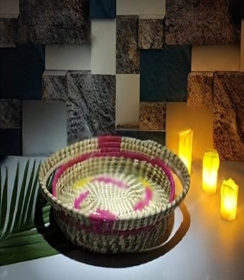 * Handwoven | Eco-Friendly | Multi-Purpose | Artisanal Elegance Elevate your home's decor with the MVB Eco Grass Craft Basket, a beautiful representation of sustainable artistry and contemporary style. Handcrafted from natural eco-friendly grass, this oval basket features an elaborate concentric circle design in deep purple, pink, white, and natural colors, making it both a useful and artistic piece in your home. With its strong handles for effortless transport, this basket is ideal for storage, organizing, or decorating, bringing an air of elegance and country charm to any space.