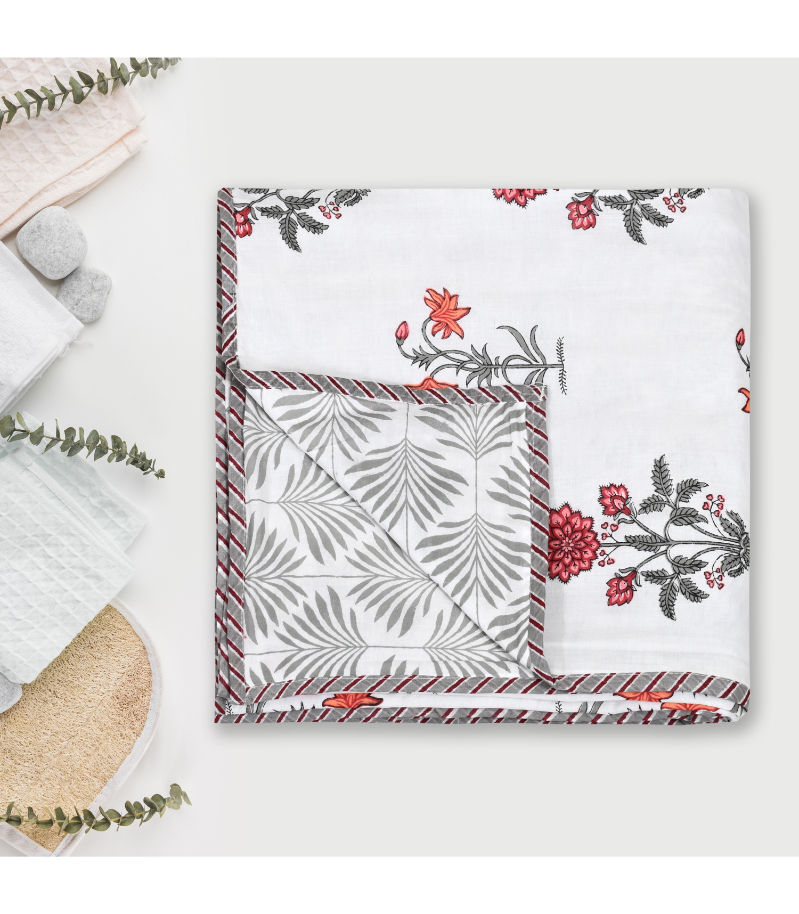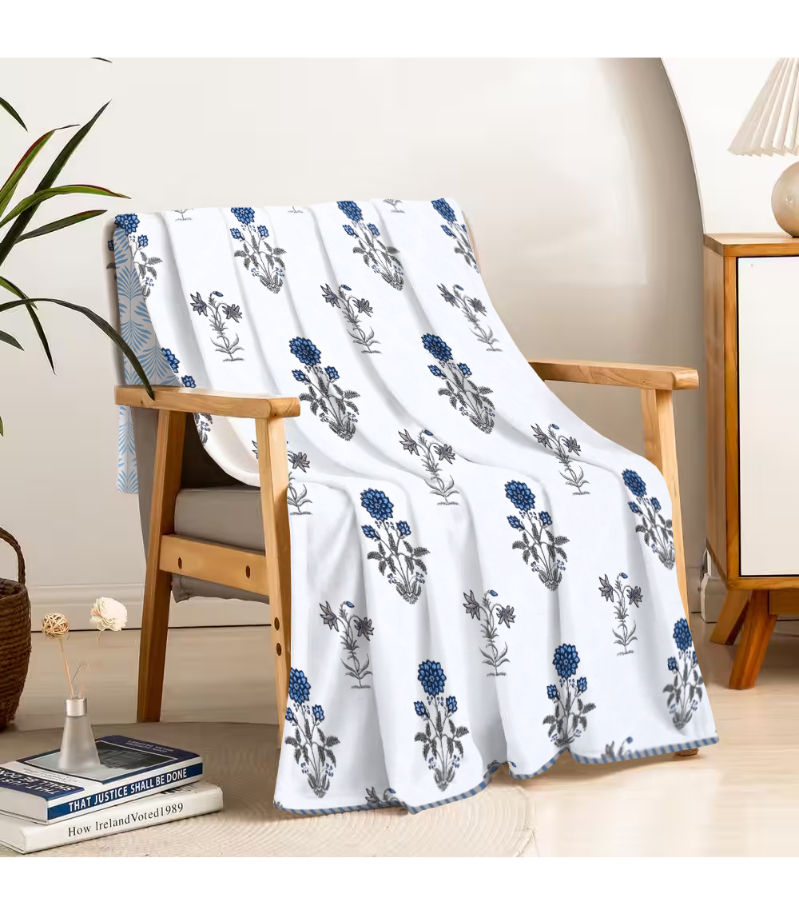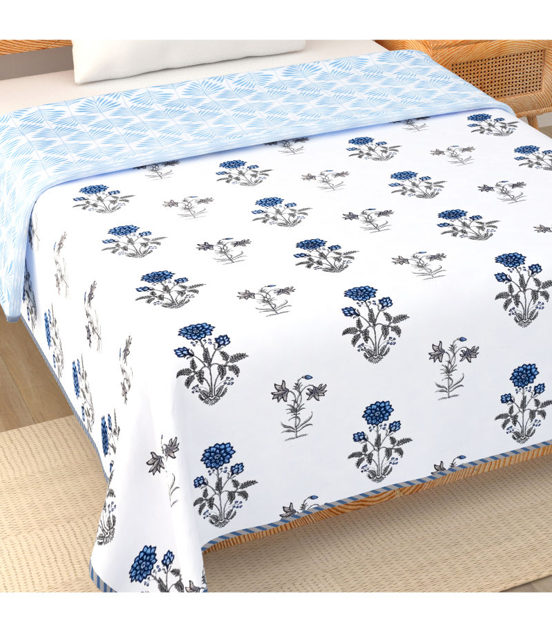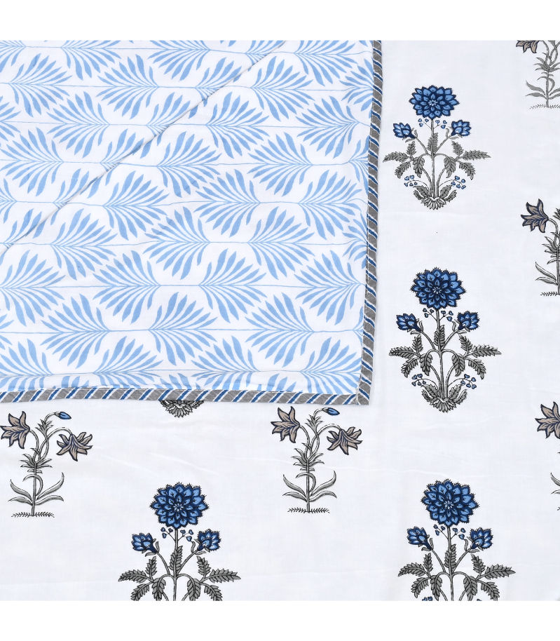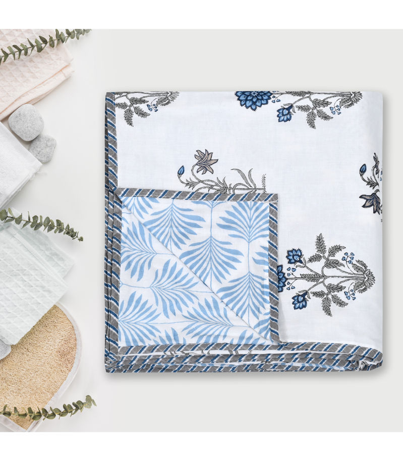 Imbued with the classic beauty of block printing and the soft opulence of 400 thread count MulMul cotton, the Elegance Azure Dohar is designed for those who love subtle luxury and nature-evoking tranquility.