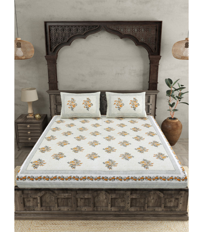 Made from 100% pure cotton, this bedsheet features exquisite Jaipuri floral prints that blend traditional artistry with modern elegance. Available in a soothing color palette, it brings a fresh, delicate touch to your living space.