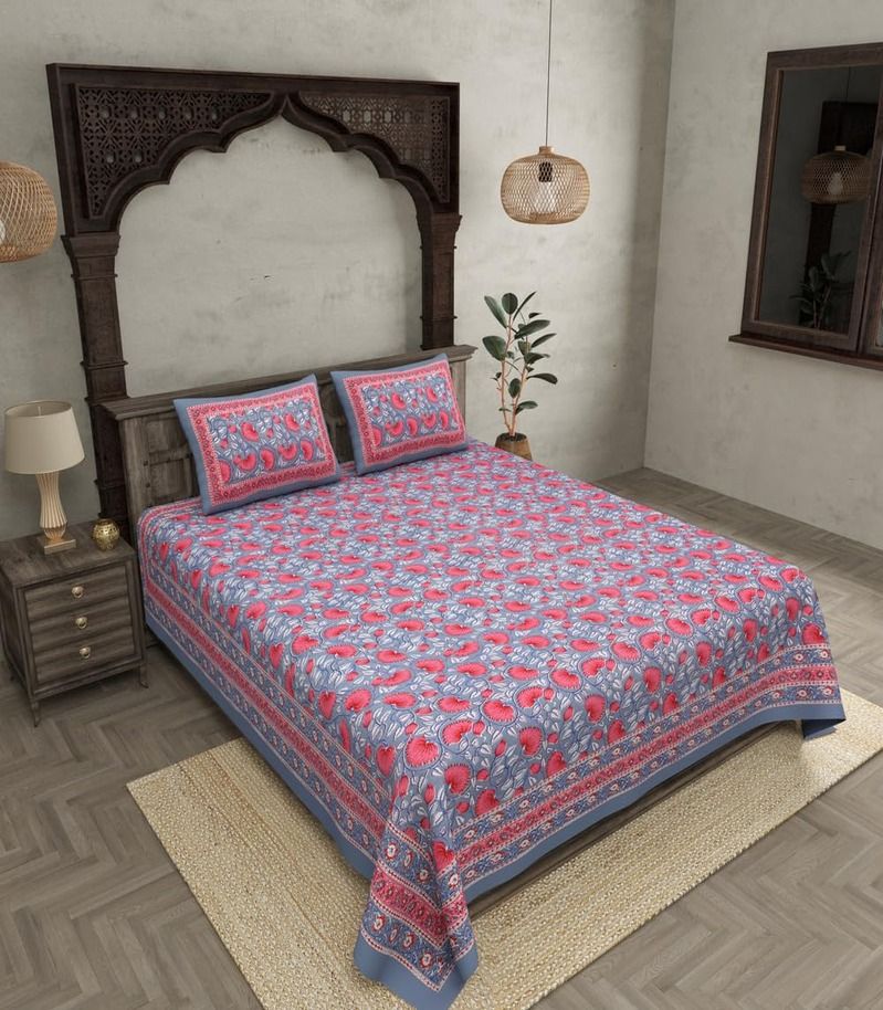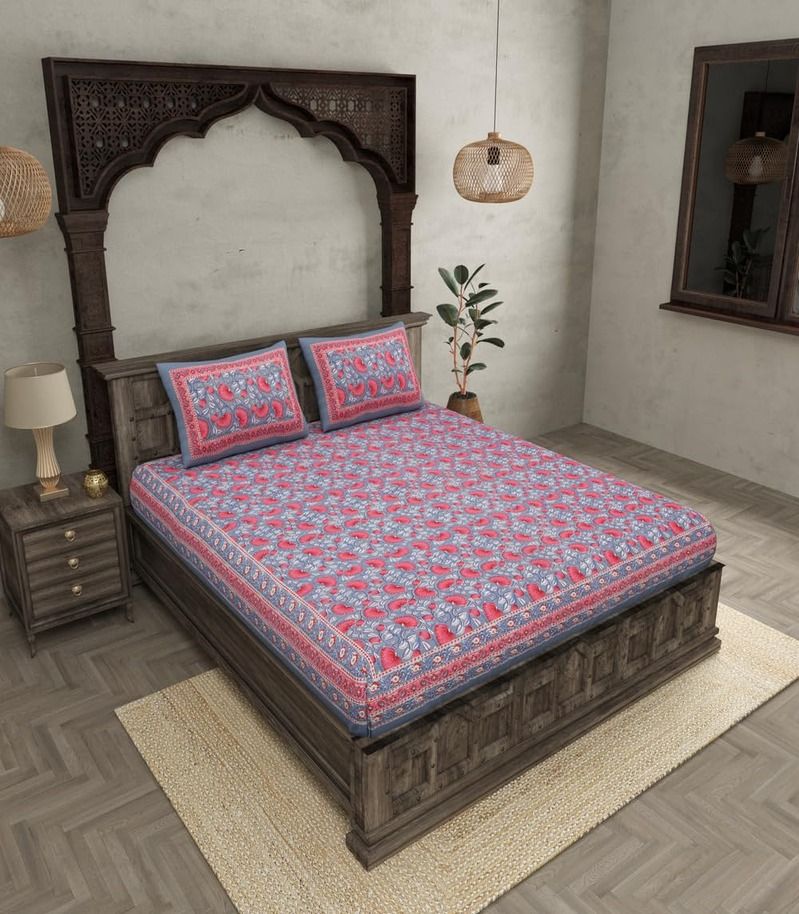Bring Nature's Beauty to Your Bedroom! Revamp your sleeping area into a floral haven with our plush, hand-block printed floral bedsheet. Madefrom 100% pure cotton and a high-quality 240 thread count, this bedsheet offersunparalleled softness, breathability, and agelesssophistication. The elegant floral patterns, inspired by nature's beauty, add freshness and calmnessto your bedroom, making it aperfectpick for contemporary and traditional settings. Key Features: 100% Pure Cotton – Soft, breathable & skin-friendly for all-season comfort. High 240 Thread Count – Silky smooth texture & long-lasting durability. Elegant Floral Design – A vibrant, nature-inspired print to uplift your space. Generous Size – 90" X 108" Double Bedsheet, ensuring perfect coverage and a secure fit. Complete Set – Includes 2 coordinating pillow covers for a harmonized bedroom look. Simple Maintenance – Colorfast & machine washable, so care is easy. Ideal Gift Option – A considerate gift for housewarmings, weddings, and festivals. Best For: ✔ Addinga bright and new floral theme to your bedroom. ✔ Giving a premium and artistic finish to loved ones. ✔ Developing a soothing and fashionableatmosphereathome. *Available inDelhi NCR | India | USA *SecurePackaging & FastShipping! *Transform your bedroom with classicsophistication – Order Now! *Checkout our website: www.mvbyugvigyana.com *WhatsAppfor bulk orders: +91-9999382518