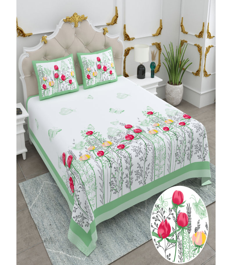 Available in vibrant shades of Green, Yellow, White, and Blue, these bedsheets are designed to elevate your bedroom decor with a perfect blend of traditional floral artistry and modern softness.