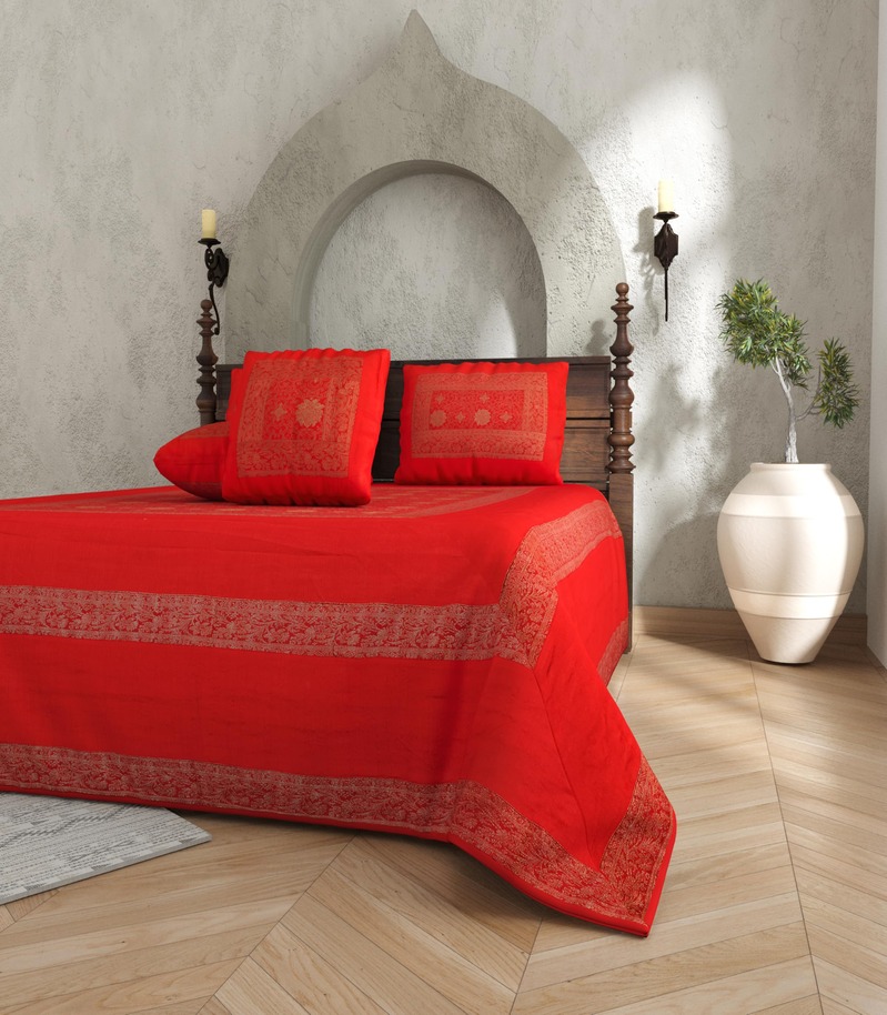 Step into a kingdom of regal opulence with our Rajasthani Zari 240TC Silk Double Bedsheets, which now come in three regal hues — Dark Green, Navy Blue, and Maroon. Each bedsheet is a work of art, woven from silk luxury and detailed with handlooming traditional zari work which pays homage to the age-old creativity of Rajasthan.