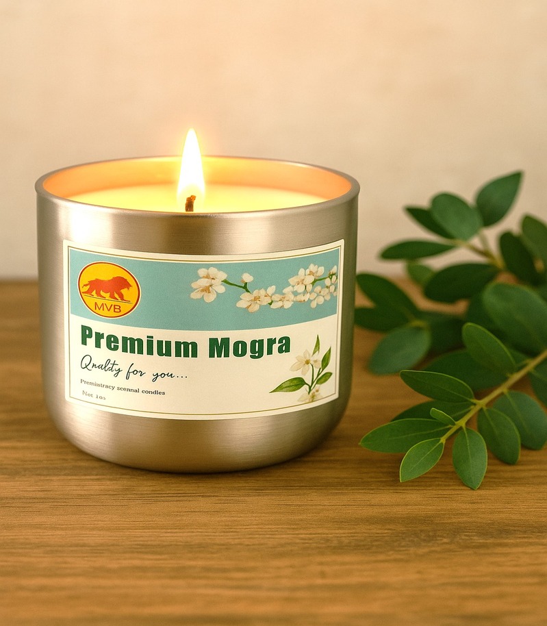 MVB Vegan Organic Hand-Poured Soya Wax Candle – Luxurious Mogra in Sleek Silver Metal Jar