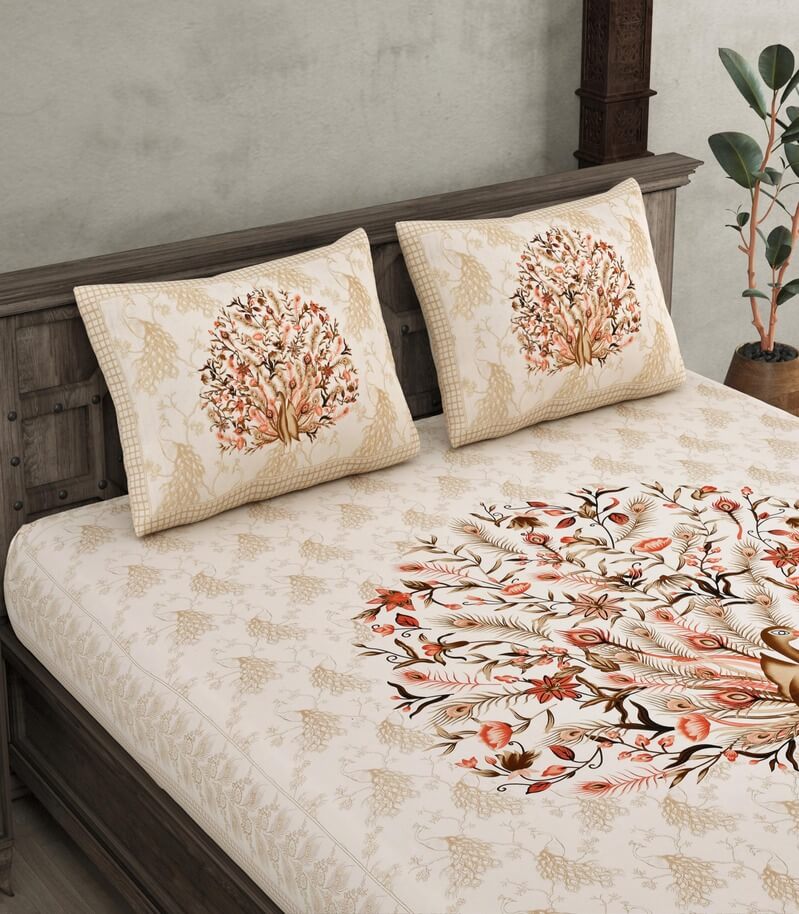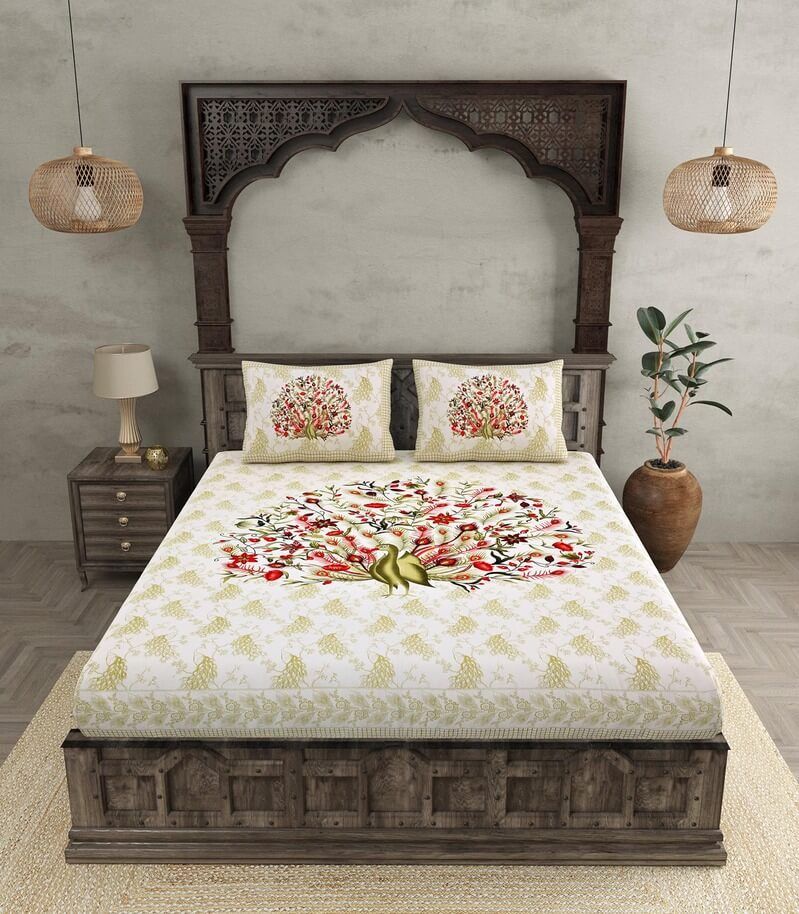 Take home a piece of Rajasthan's royal craftsmanship 180 TC 100% Cotton Jaipuri Peacock Printed Bedsheet.