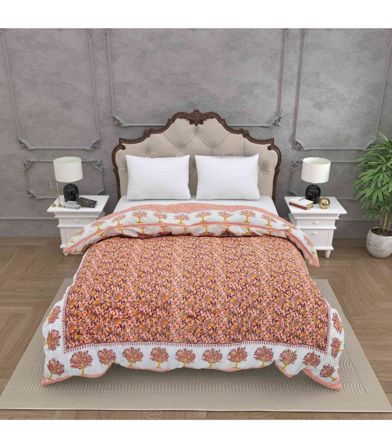Introduce a warm, artistic touch to your bedroom with the Saffron Tree Motif Harmony Floral Print Double Sided Quilt Rajai.
