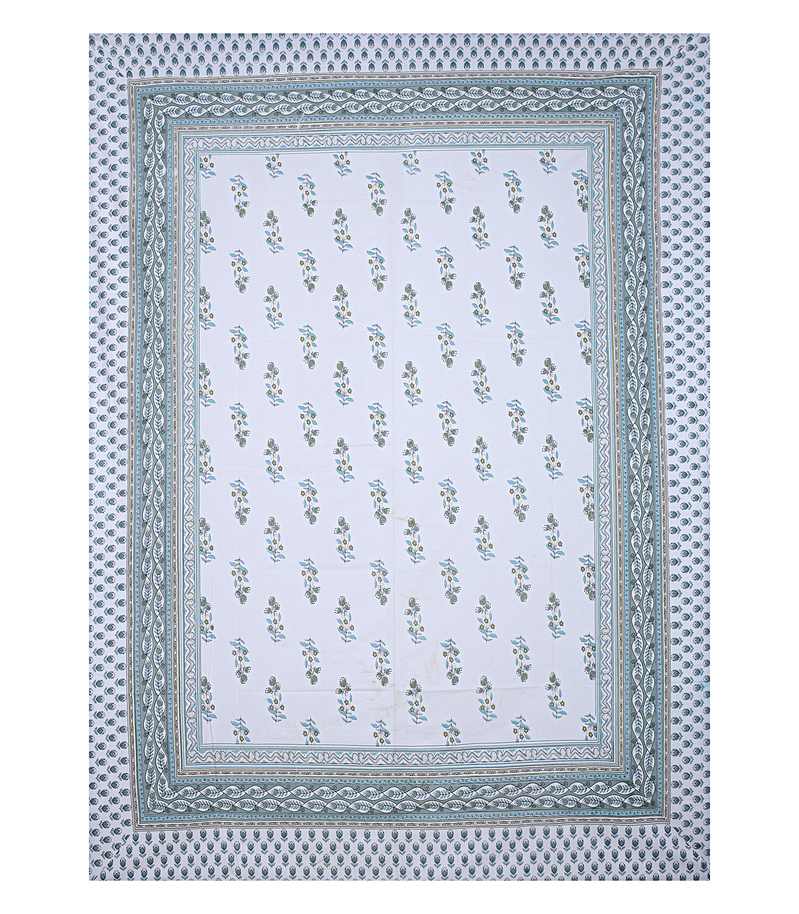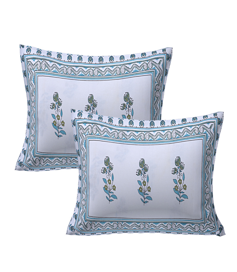 Whispering Green Pure Cotton Bedsheets are made with intricate design, floral patterns, and a perfect blend of geometric patterns. The soft hues of green, blue, and white create an atmosphere of peace in any bedroom. The sheet has small flowers scattered all over the sheet and borders with rich designs, like waves and leaves. The pillowcases complement the set and make it a perfect combination.