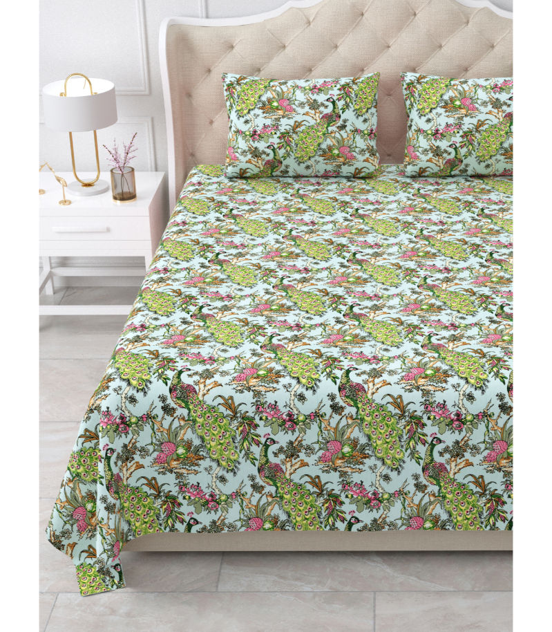 This luxurious bedsheet features stunning peacock feather-inspired patterns on a calming blue base, beautifully crafted from premium pure cotton for utmost softness and breathability.