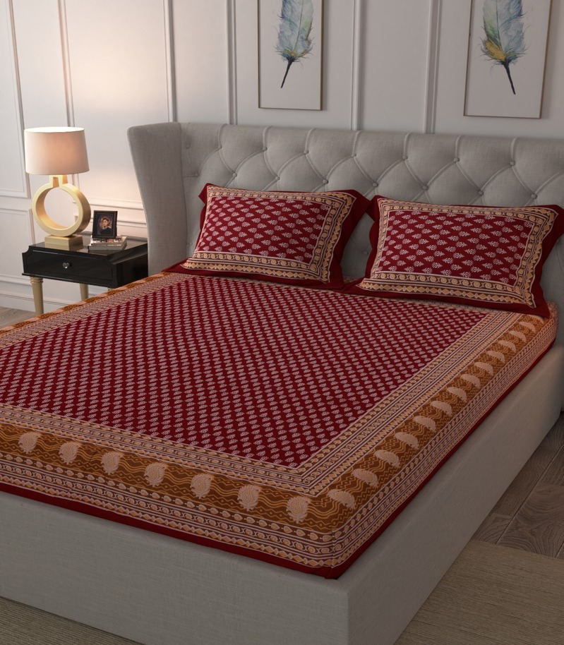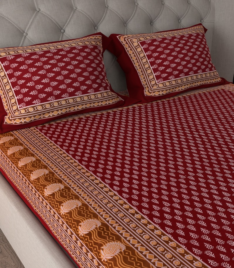 MVB 100% Pure Cotton Double Bed Sheet Set – Red & Brown Elegance with 2 Pillow Covers