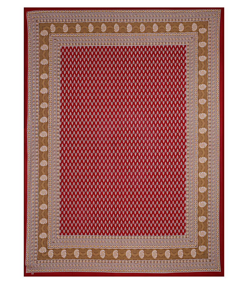 The rich red base with ornate white motifs, complemented by a contrasting brown border with bold decorative patterns, adds a timeless, yet contemporary look to your bedroom. Whether for everyday or special use, this bedsheet is a testament to good taste and comfort.