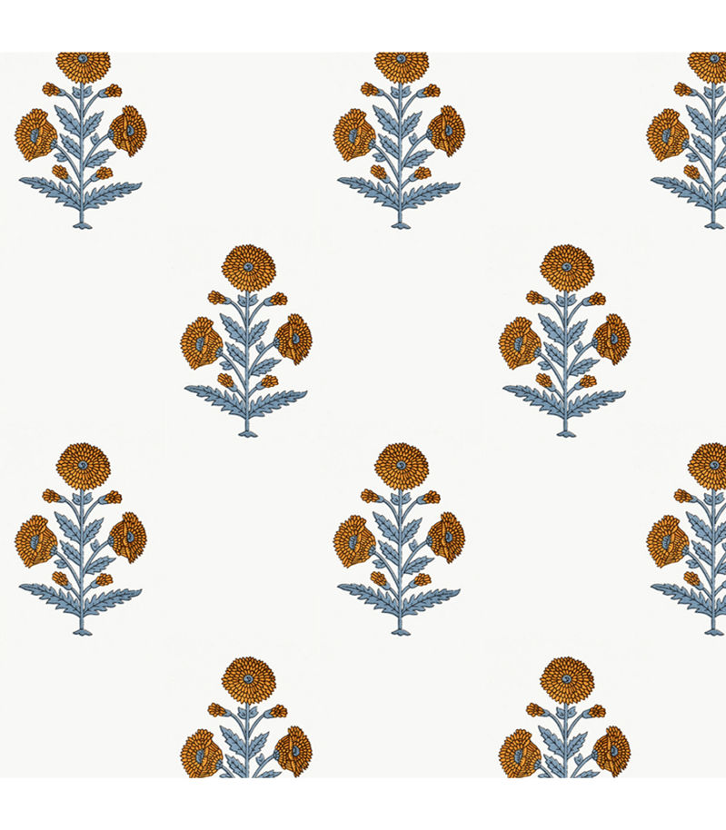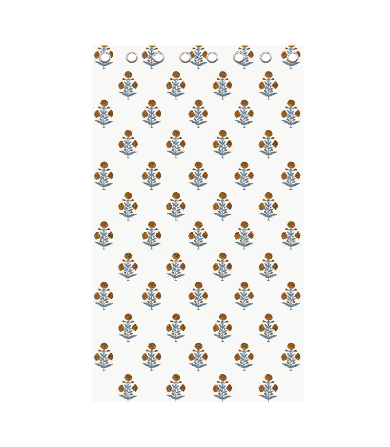 Imagine golden sunlight pouring through soft cotton curtains, gently highlighting the charm of marigold flowers and delicate grey leaves printed in timeless boota style.