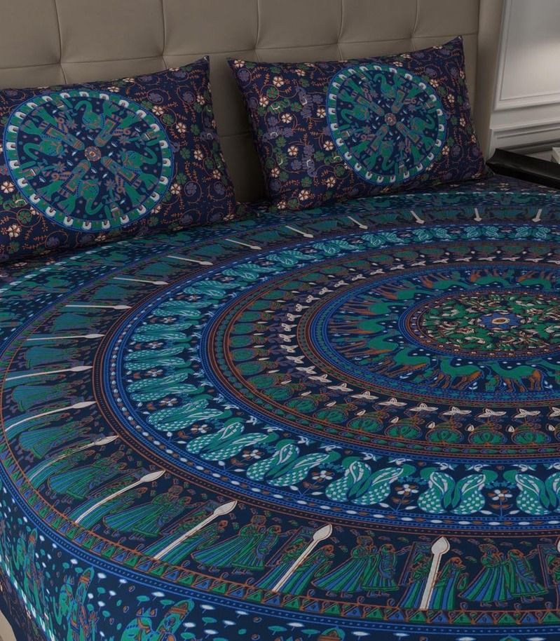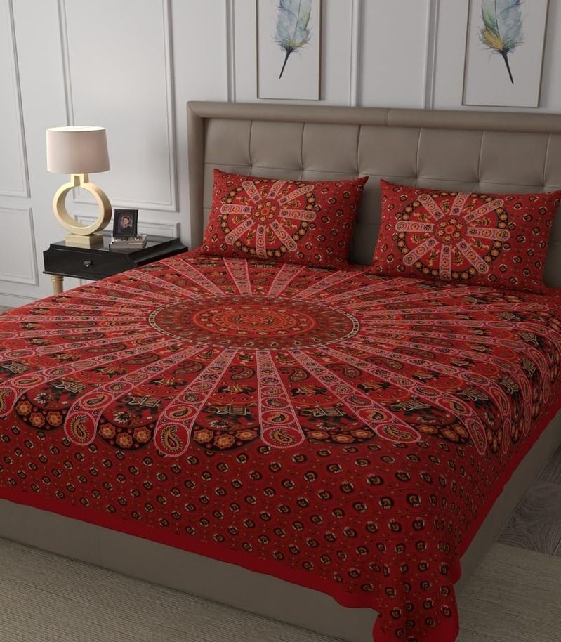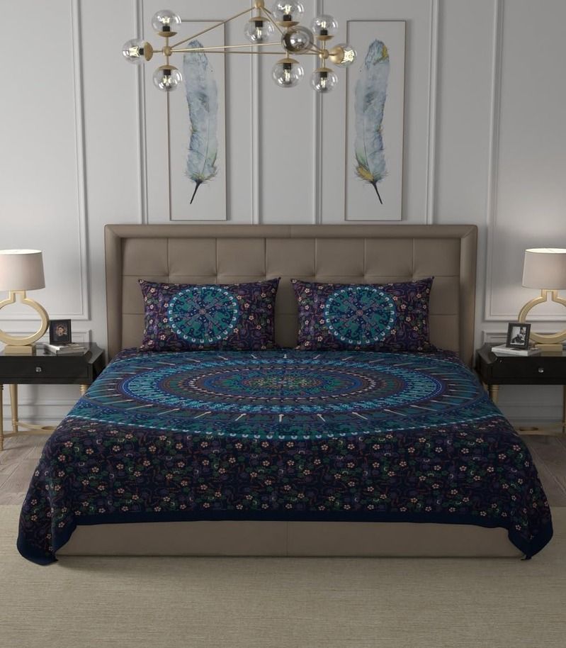Rangoli Charm 180 TC Cotton Double Bedsheet Set – Red & Blue Sick of boring, lifeless bedsheets. Brighten up your bedroom with this Rangoli-inspired double bedsheet set in a vibrant blend of red and blue.