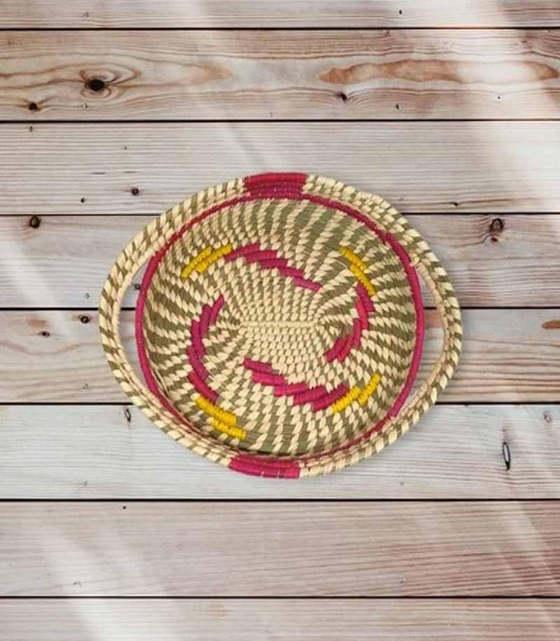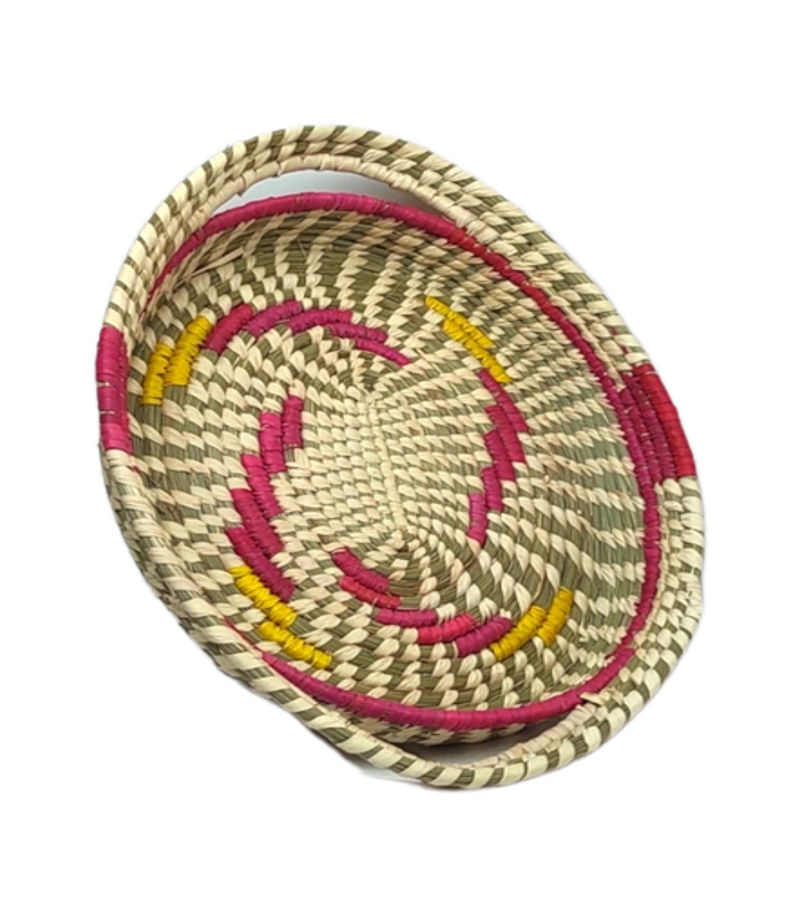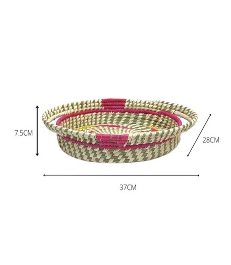 * Handwoven | Eco-Friendly | Multi-Purpose | Artisanal Elegance Elevate your home's decor with the MVB Eco Grass Craft Basket, a beautiful representation of sustainable artistry and contemporary style. Handcrafted from natural eco-friendly grass, this oval basket features an elaborate concentric circle design in deep purple, pink, white, and natural colors, making it both a useful and artistic piece in your home. With its strong handles for effortless transport, this basket is ideal for storage, organizing, or decorating, bringing an air of elegance and country charm to any space.