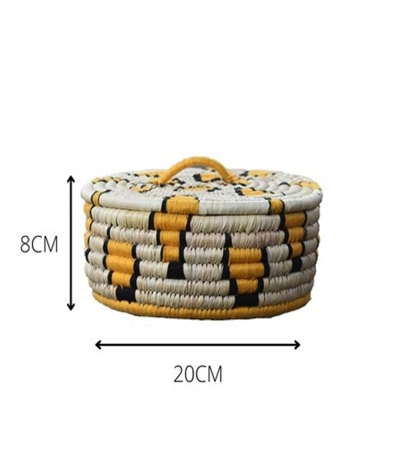 * Exquisite Geometric Pattern – This round basket is tastefully decorated with a beige, gray, and yellow woven pattern, making it both functional and decorative.