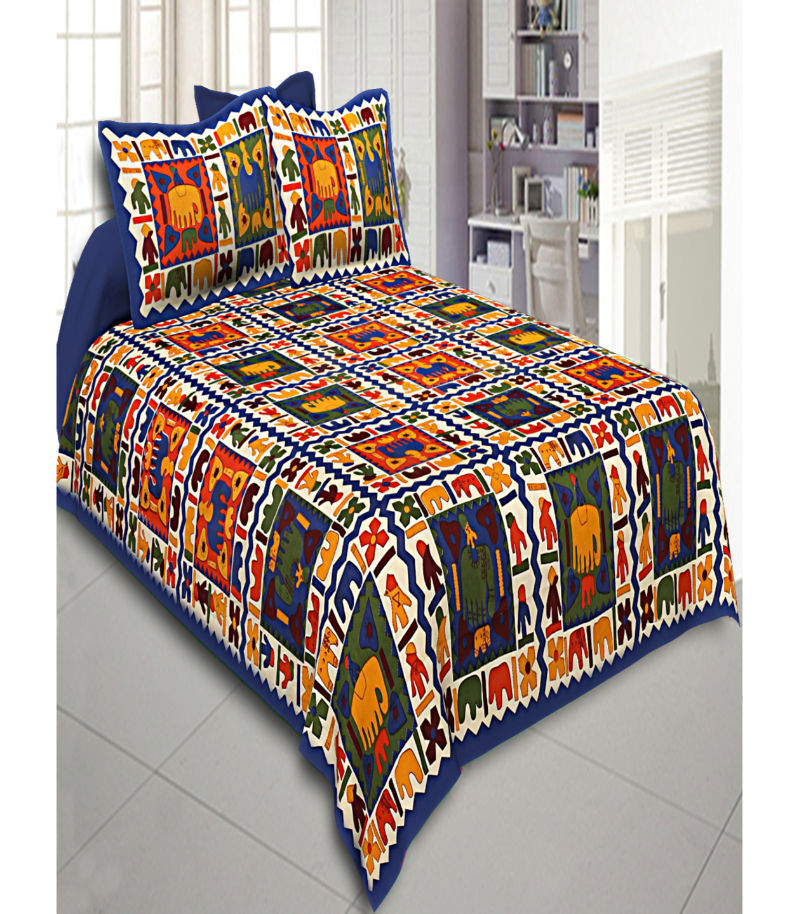 Name: Elephant Pattern Screen Print Double Bed Sheet (Blue, Multi, Maroon)