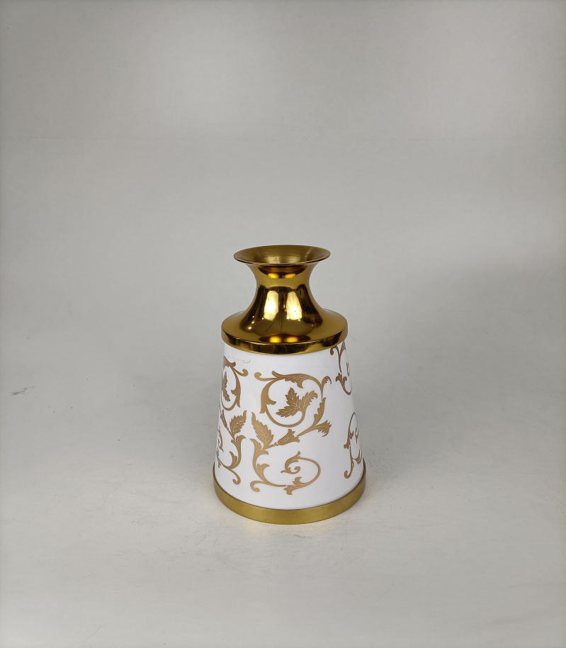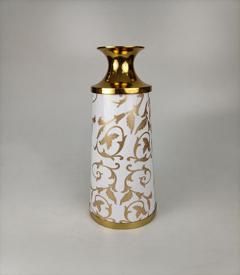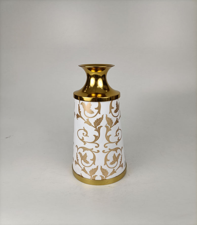 This exquisite flower vase is a real work of art, marrying strength, artistic skill, and contemporary style. The iron base provides durability and longevity, while the gold-plated aluminum details add a note of royalty and sophistication. The fine embossed pattern, complemented with a protective resin sealant, makes this item an elegant addition to any setting.
