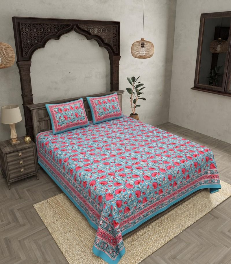 Bring Nature's Beauty to Your Bedroom! Revamp your sleeping area into a floral haven with our plush, hand-block printed floral bedsheet. Madefrom 100% pure cotton and a high-quality 240 thread count, this bedsheet offersunparalleled softness, breathability, and agelesssophistication. The elegant floral patterns, inspired by nature's beauty, add freshness and calmnessto your bedroom, making it aperfectpick for contemporary and traditional settings. Key Features: 100% Pure Cotton – Soft, breathable & skin-friendly for all-season comfort. High 240 Thread Count – Silky smooth texture & long-lasting durability. Elegant Floral Design – A vibrant, nature-inspired print to uplift your space. Generous Size – 90" X 108" Double Bedsheet, ensuring perfect coverage and a secure fit. Complete Set – Includes 2 coordinating pillow covers for a harmonized bedroom look. Simple Maintenance – Colorfast & machine washable, so care is easy. Ideal Gift Option – A considerate gift for housewarmings, weddings, and festivals. Best For: ✔ Addinga bright and new floral theme to your bedroom. ✔ Giving a premium and artistic finish to loved ones. ✔ Developing a soothing and fashionableatmosphereathome. *Available inDelhi NCR | India | USA *SecurePackaging & FastShipping! *Transform your bedroom with classicsophistication – Order Now! *Checkout our website: www.mvbyugvigyana.com *WhatsAppfor bulk orders: +91-9999382518