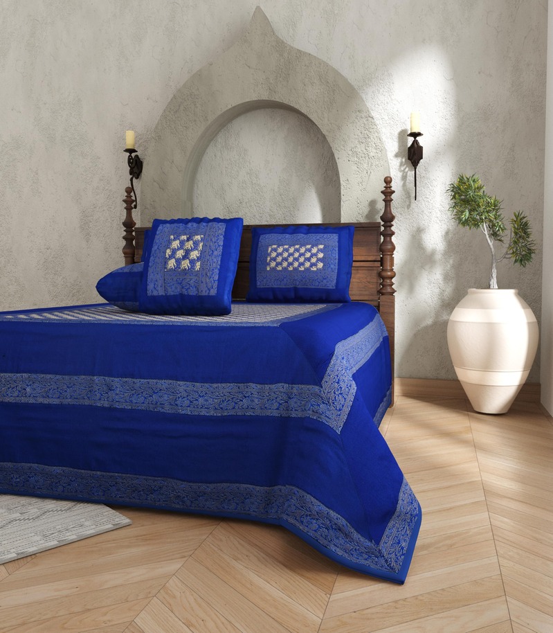 Step into a kingdom of regal opulence with our Rajasthani Zari 240TC Silk Double Bedsheets, which now come in three regal hues — Dark Green, Navy Blue, and Maroon. Each bedsheet is a work of art, woven from silk luxury and detailed with handlooming traditional zari work which pays homage to the age-old creativity of Rajasthan.
