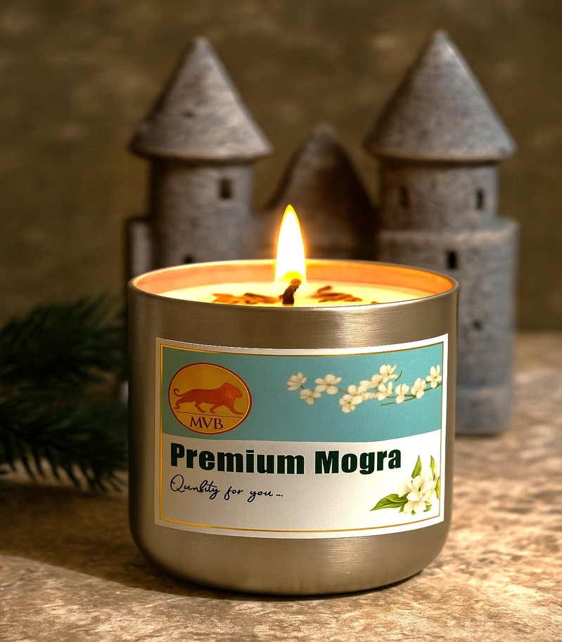 MVB Vegan Organic Hand-Poured Soya Wax Candle – Luxurious Mogra in Sleek Silver Metal Jar