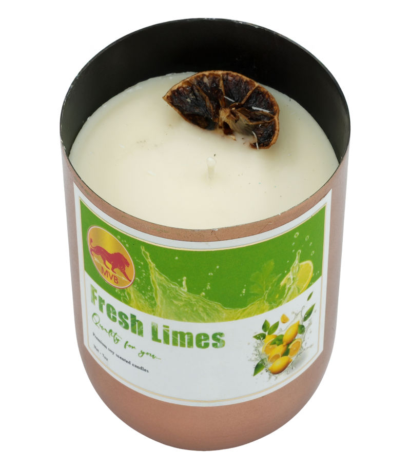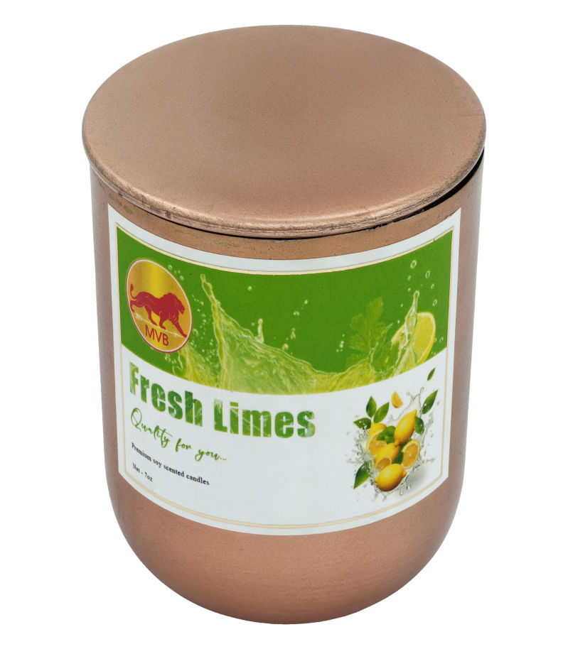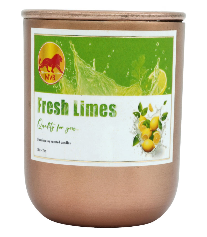 Unleash the classy freshness of MVB Vegan Organic Hand-Poured Pure Soya Wax Candle, beautifully packaged in a beautiful copper metal jar with the citrus, zesty beauty of Lime Essential Oil.
