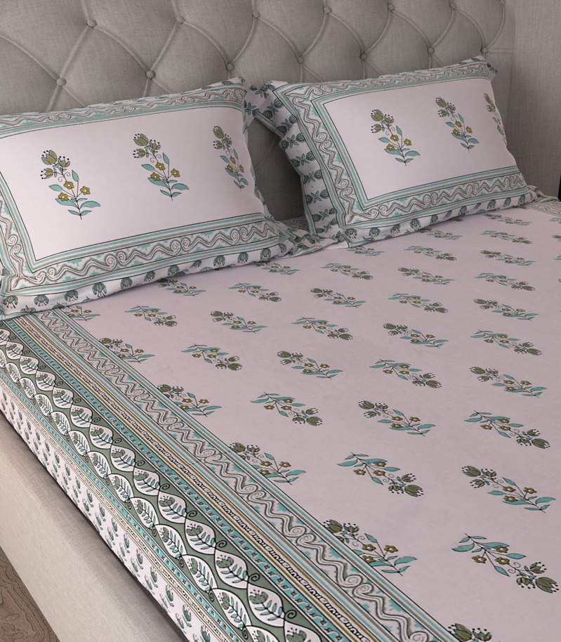 Whispering Green Pure Cotton Bedsheets are made with intricate design, floral patterns, and a perfect blend of geometric patterns. The soft hues of green, blue, and white create an atmosphere of peace in any bedroom. The sheet has small flowers scattered all over the sheet and borders with rich designs, like waves and leaves. The pillowcases complement the set and make it a perfect combination.
